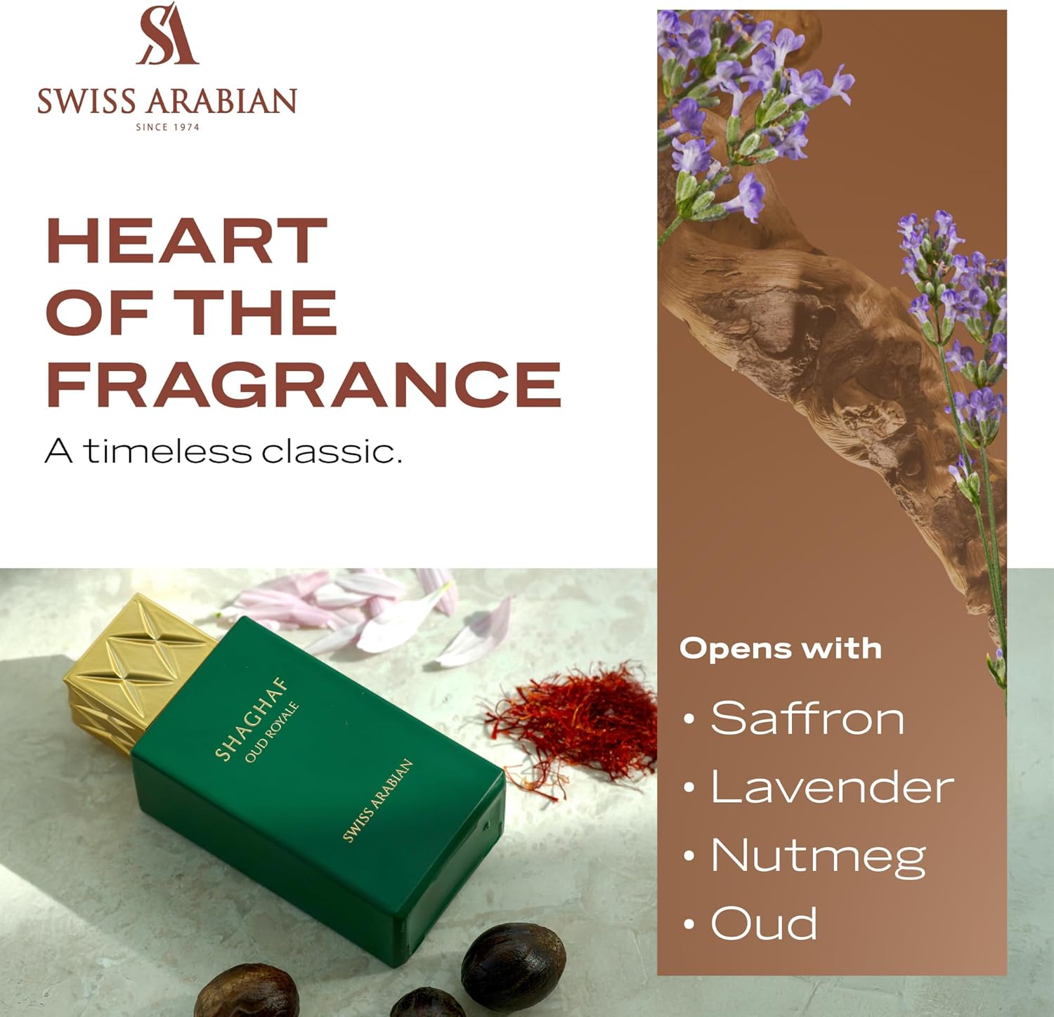 AN ENCHANTING OPENING DUO: Shaghaf Oud Royale Eau De Parfum casts an opulent spell from the very first spritz, blending the rich, golden warmth of saffron with the calming elegance of lavender in a refined unisex fragrance experience